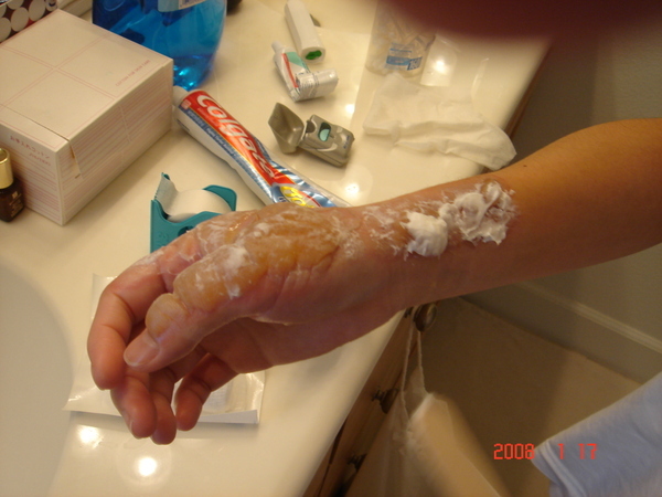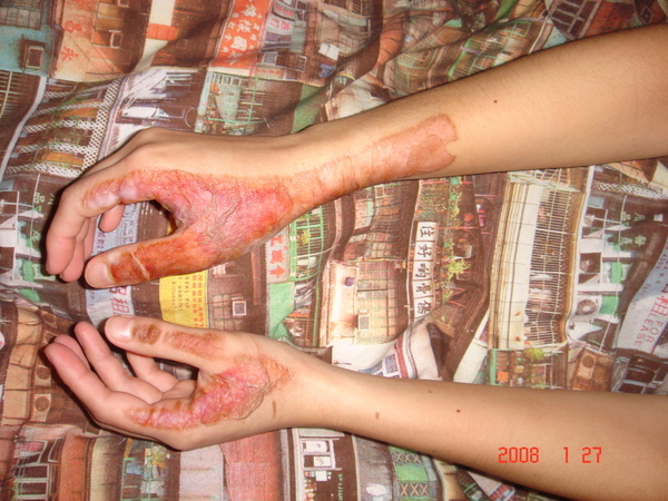在2008/1/16的傍晚發生了一件事, 我被燙傷了...而且是二級燙傷, 是會留疤的. 煮菜時, 不小心燙到了. 很痛, 但是不敢哭說. 二姐說看起來像豬腳...所以簡稱"豬腳手". 燙傷的第二天 <img border=0 src="http://pic.pimg.tw/ruby1218/1211840454.jpg"> 燙傷的第十天 <img border=0 src="http://pic.pimg.tw/ruby1218/1211840456.jpg"> <!-- more -->