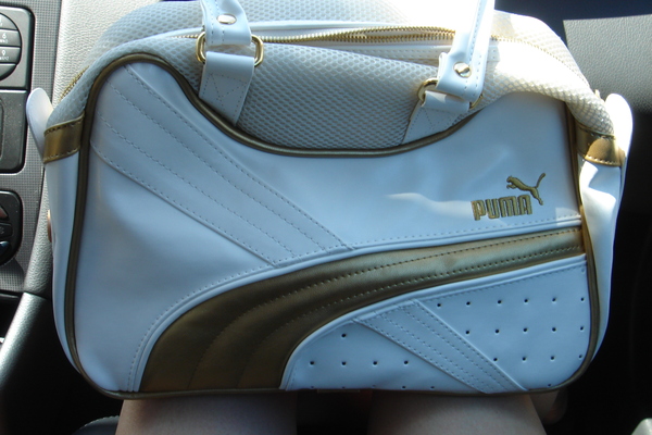 上次回台灣買的貓狗包不耐用, 裝一些重的東東背帶就斷ㄌㄟ, 火大了. 我7月初就在PUMA outlet買了這個包. 要買之前還在考慮是要買Coach or Via Spiga的包. 但想想, 用名牌包好麻煩, 擔心弄髒刮傷, 擔心風吹日曬雨淋. 所以就決定買這個耐用又便宜的PUMA包來外出用啦.